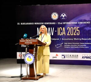 Kuzey Kıbrıs Türk Cumhuriyeti Maliye Bakanlığı Muhasebe ve Denetim Kurulu Başkanı Saadet Hüdaverdi, konferansın temasının yöneticiler ve toplum için etik bir sorumluluk çağrısı olduğunu vurguladı. Hüdaverdi, muhasebe ve denetim alanının sürdürülebilirlik, dijitalleşme ve küresel dönüşüm süreçleriyle yeniden şekillendiğine dikkat çekti ve denetim faaliyetlerinin yalnızca hesap soran bir mekanizma olmadığını, aynı zamanda ulusal ve uluslararası iş birliklerini güçlendiren bir vizyonu temsil ettiğini belirtti.