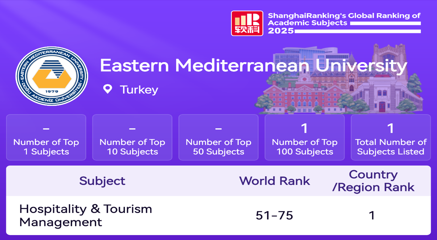 DAÜ listeye bu alanda Kuzey Kıbrıs Türk Cumhuriyeti (KKTC) ve Türkiye Cumhuriyeti’nden girme başarısını gösteren tek üniversite olurken, Kıbrıs adasında da birinci sırayı elde etti. Listede 100 farklı ülkeden sıralamaya girebilme potansiyeli taşıyan 5,000 üniversite arasından 2,000 civarında üniversite sıralanmaya layık görüldü. 2019 yılından itibaren aralıksız Ağırlama ve Turizm Yönetimi alanında Türkiye ve Kıbrıs adasında listede yer alan tek üniversite DAÜ oldu.